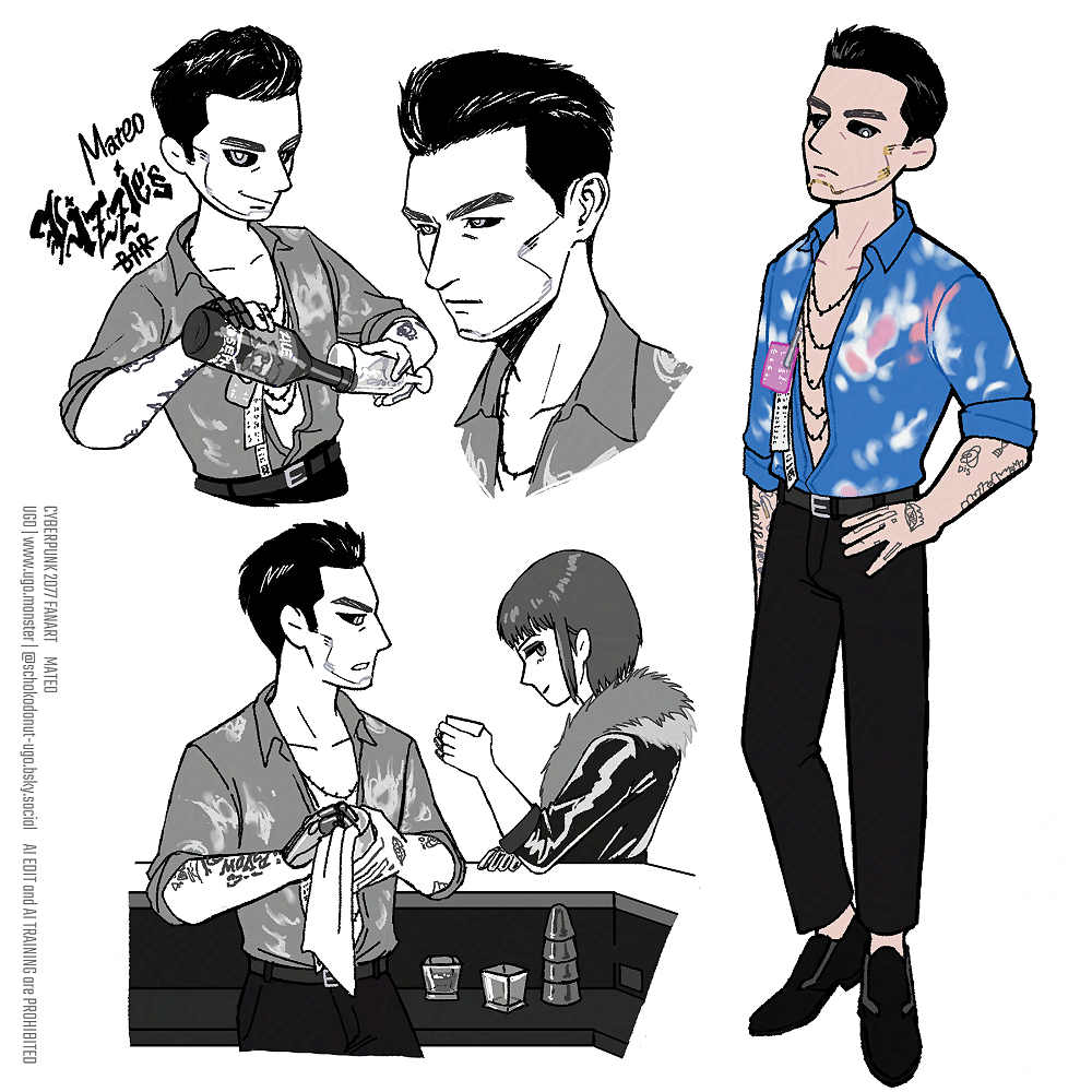 前にも描いたかもしれないが、マテオさんはナイトシティのギャングの一つであるモックスが管理する”リジーズ・バー”のバーテンダーをやってる男性です。