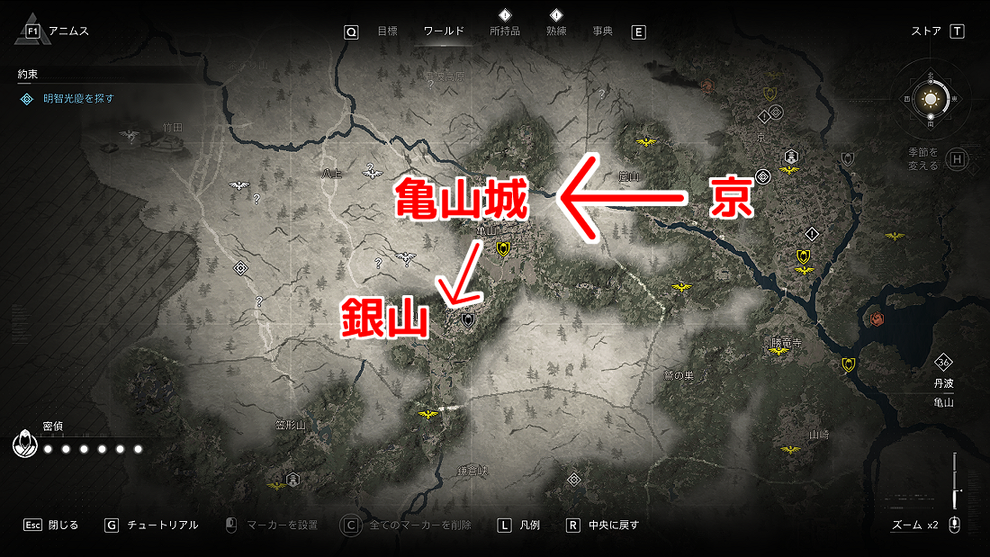 後からでもいいが、丹波エリアの物見処にシンクロしてなくてこれからという場合、京から向かって亀山城でシンクロしておいて、それから銀山へ行くと効率良いです。この白銀御前一連のクエストの途中で亀山城へ行くので。